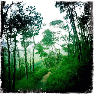 Today's hike began in rain which the volunteer at the shuttle station said would blow over, and it did. The trail wandered me up and over a small hill in a pine forest to a small lake surrounded by forest. A few rocks along the edge provided seats for visitors. I had a snack and watched dragonflies in the reeds. An unidentified brown duck dabbled.