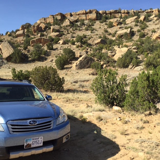 Then I drove on to Seama, fifty miles farther west. I did not actually expect to see this arrow because it sits on top of a mesa 200 feet above a dirt road, a mesa topped with a cap of sandstone that looked, again from Google Earth, to be unscaleable. A dirt road that led to the top of the mesa looked a bit challenging for the Subaru. And it was likely on Indian land. That said, I took my sneakers anyway.